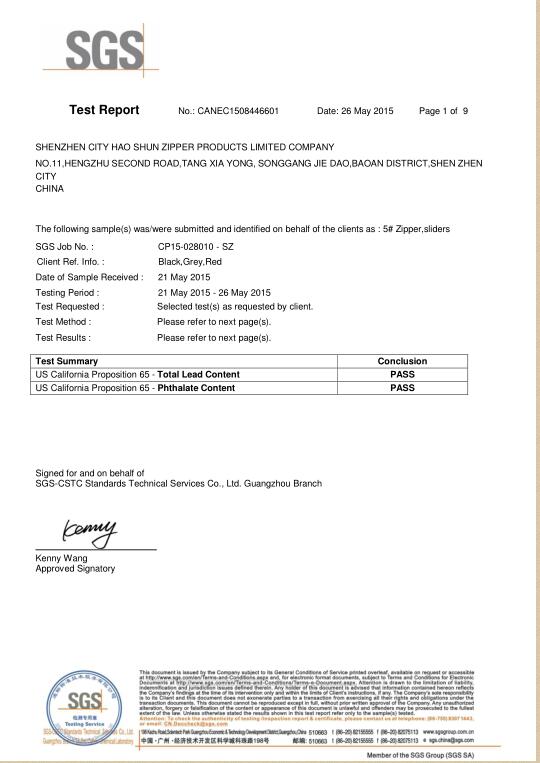 深圳豪順拉鏈《加州65鉛和鄰苯測(cè)試報(bào)告》
